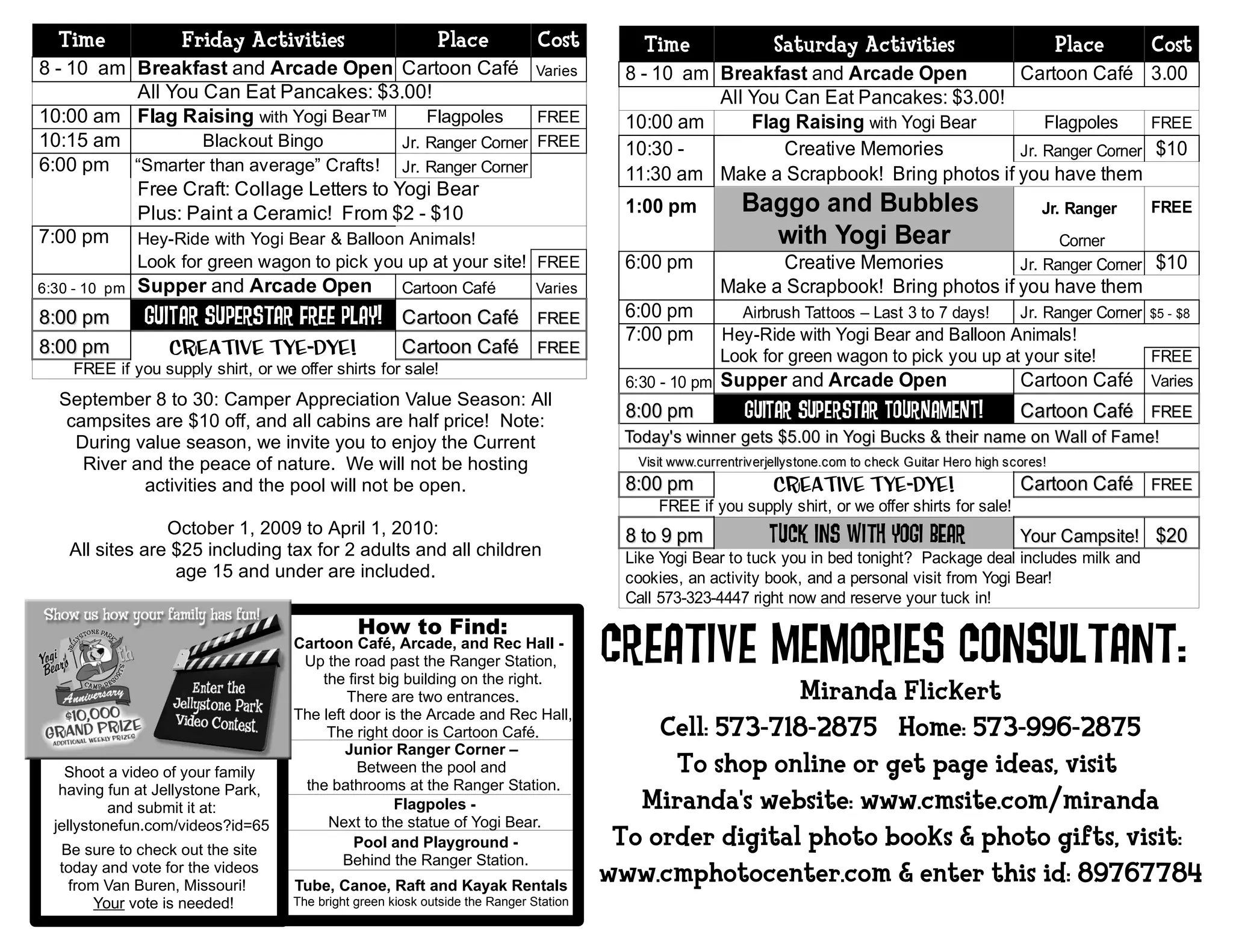 This document provides the schedule of activities for the weekend at Yogi Bear's Jellystone Park Camp-Resort in Van Buren, Missouri from August 28-30, 2009. On Friday, activities include flag raising, bingo, crafts, a hayride with Yogi Bear, and guitar performances. Saturday activities involve flag raising, scrapbooking classes, crafts, a hayride, and a guitar tournament. Sunday includes flag raising, a birthday party for Yogi Bear, tattoos, a photo contest, crafts, and baggo with Yogi Bear. Most activities are free while some have small costs and take place at locations around the campground.