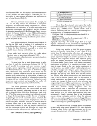 The document proposes updated definitions for technology, manufacturing, and services readiness levels based on lean product development principles. It argues the current definitions promote a flawed "build-test-fix" approach and presents alternative "Lean TRL", "Lean MRL", and "SRL" definitions grounded in robust design, design for six sigma, and lean principles. The updated levels aim to characterize and validate performance earlier to reduce costly late iterations compared to the conventional approach.