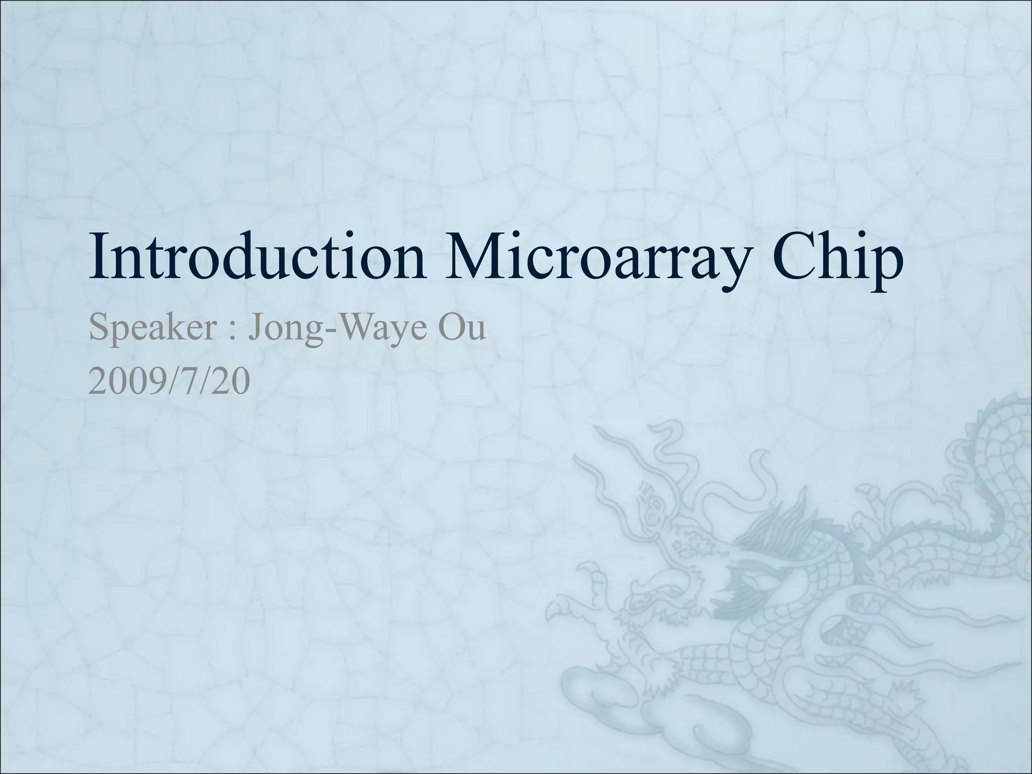 Introduction What isBioChip ? 生物晶片是泛指採用半導體策略於生物性分析所產生的微小化裝置,也就是將傳統大型的分析、檢驗等器具,予以微小化、積體化以及平行多工化。生物晶片通常以矽晶片、玻璃或高分子為基質,以微小化技術整合生物有機分子 ( 如核酸或蛋白質 ) 為生化探針,用來檢測或分析生物性分子。生物晶片的體積小、反應快速並且能夠平行分析大量生物資訊,因此適用於生化處理、分析、檢驗、新藥開發及環境監測等用途上。