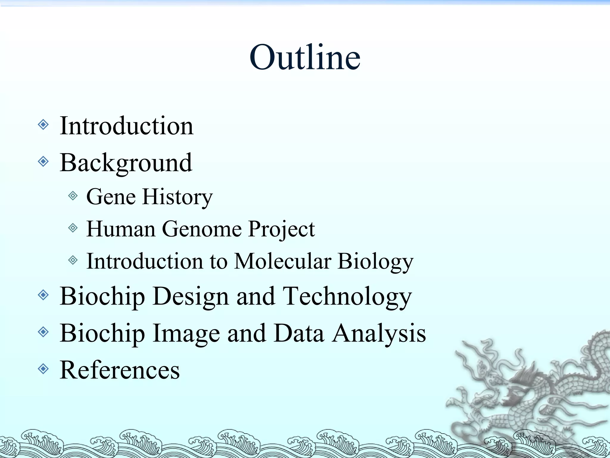 Outline Introduction BackgroundGene History Human Genome Project Introduction to Molecular Biology Biochip Design and Technology Biochip Image and Data Analysis References