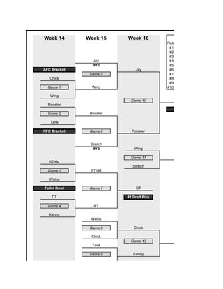 The document outlines the playoff bracket and draft order for a fictional football league in 2010. It shows the playoff matchups in Weeks 14, 15 and 16, with the winner of Game 7 picking #1 in the draft and the Super Bowl champion picking last. It lists the teams Jay, Chick, DT, Rooster, Kenny, STYM, Stretch, Waibs, Tank and Wing in the playoff bracket and 2010 draft order.