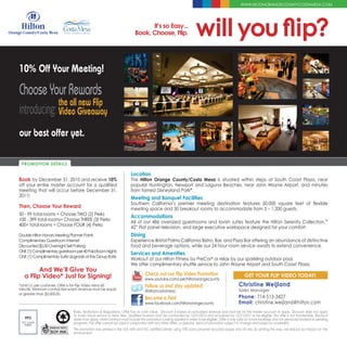 The Hilton Orange County/Costa Mesa is offering a promotion where meeting planners can receive a 10% discount on their master account for meetings booked by December 31, 2010, and held before December 31, 2011. The hotel features 50,000 square feet of flexible meeting space and provides various perks based on the number of rooms booked. Additional amenities include a complimentary shuttle service, dining options, and a promotional video giveaway for participants.