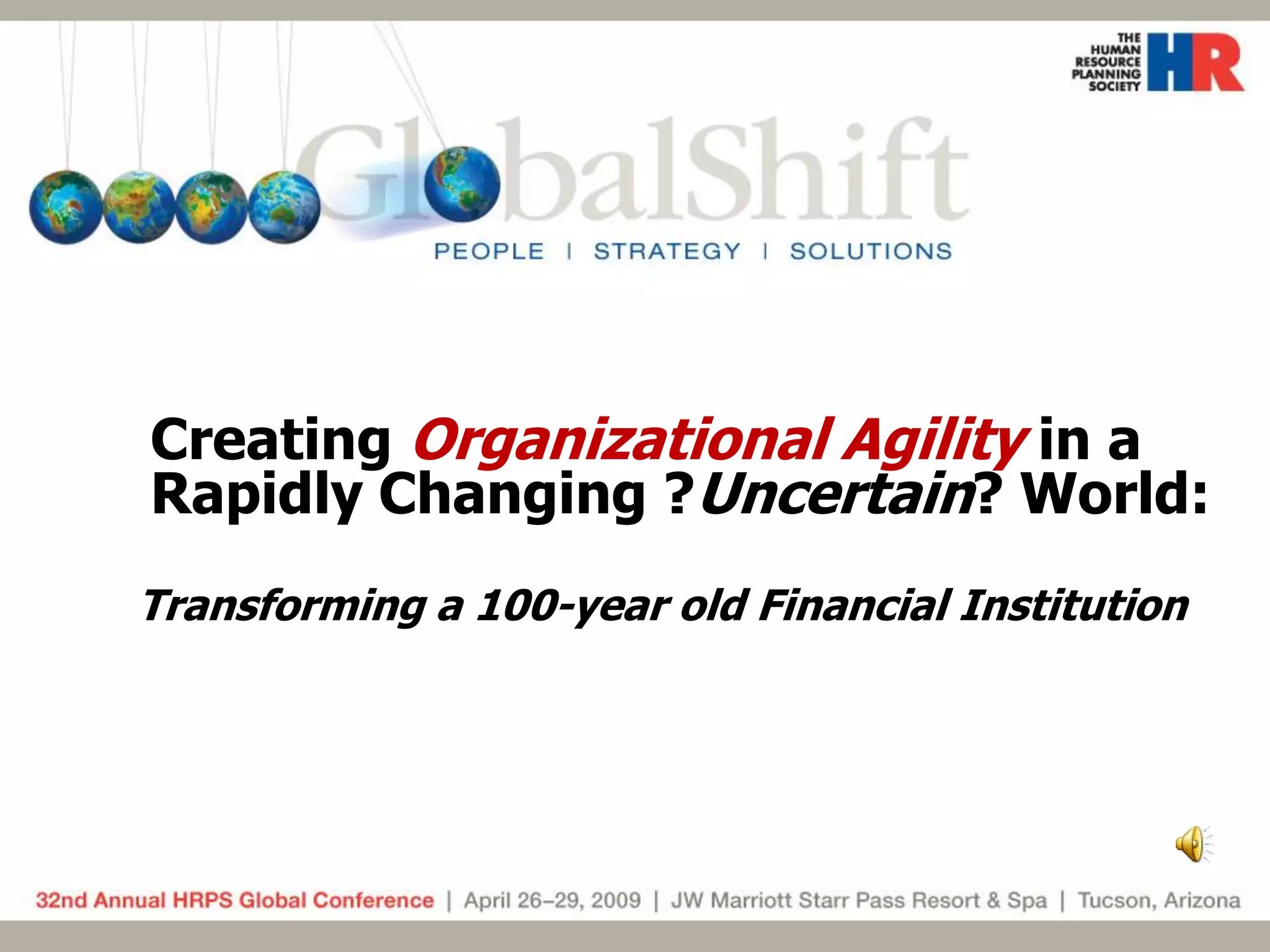 This document discusses transforming a 100-year-old financial institution to create organizational agility in a rapidly changing world. It summarizes: