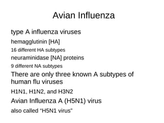 This document discusses the influenza virus and different flu outbreaks throughout history. It provides statistics on deaths from the 1918 Spanish flu, 1957 flu, and 1968 flu pandemics as well as the 2009 H1N1 outbreak. It also summarizes the structure and transmission of influenza viruses, symptoms in birds, and methods of vaccination including inactivated, attenuated, and recombinant DNA vaccines.