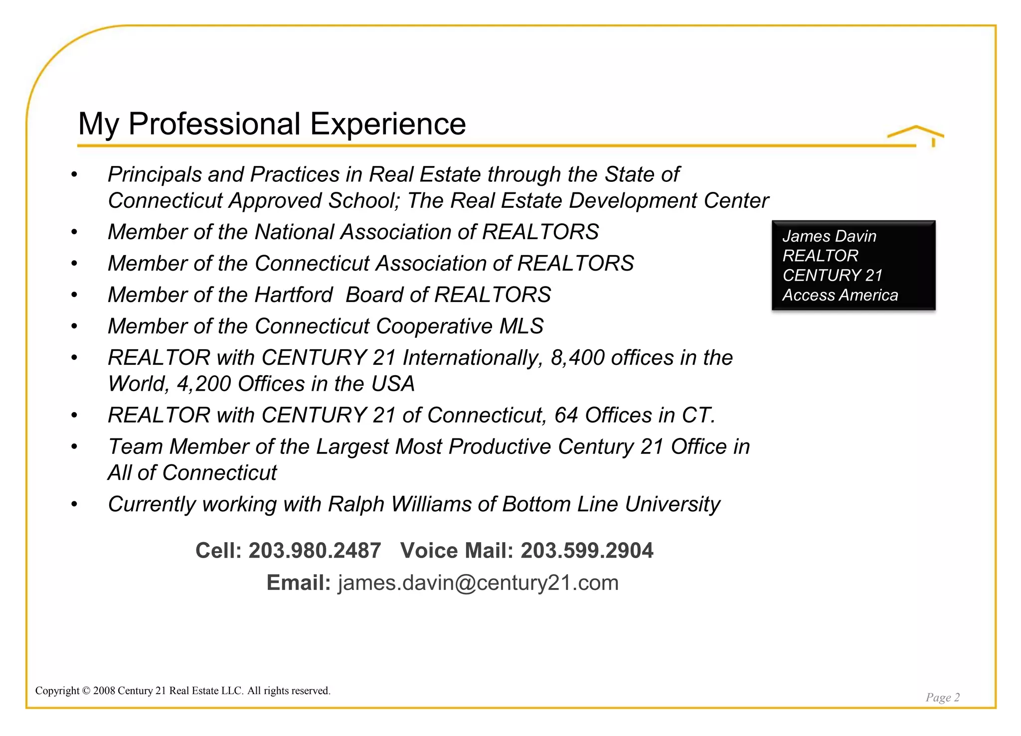 This document is a marketing proposal from James Davin of Century 21 Access America to market a property. It summarizes James' experience, the strengths of Century 21 including its large network and brand recognition, and details an extensive marketing plan utilizing various online and print strategies to maximize exposure and sell the property.