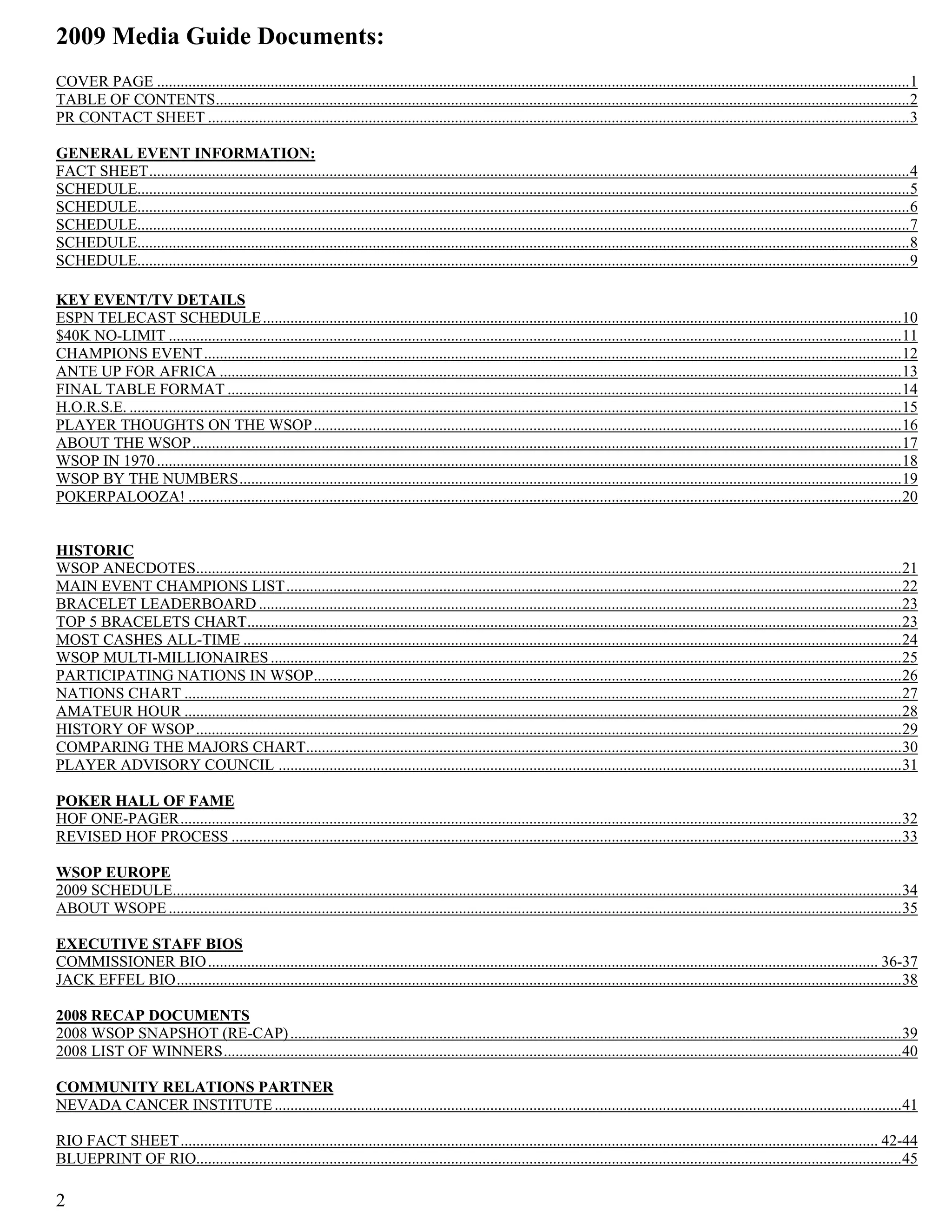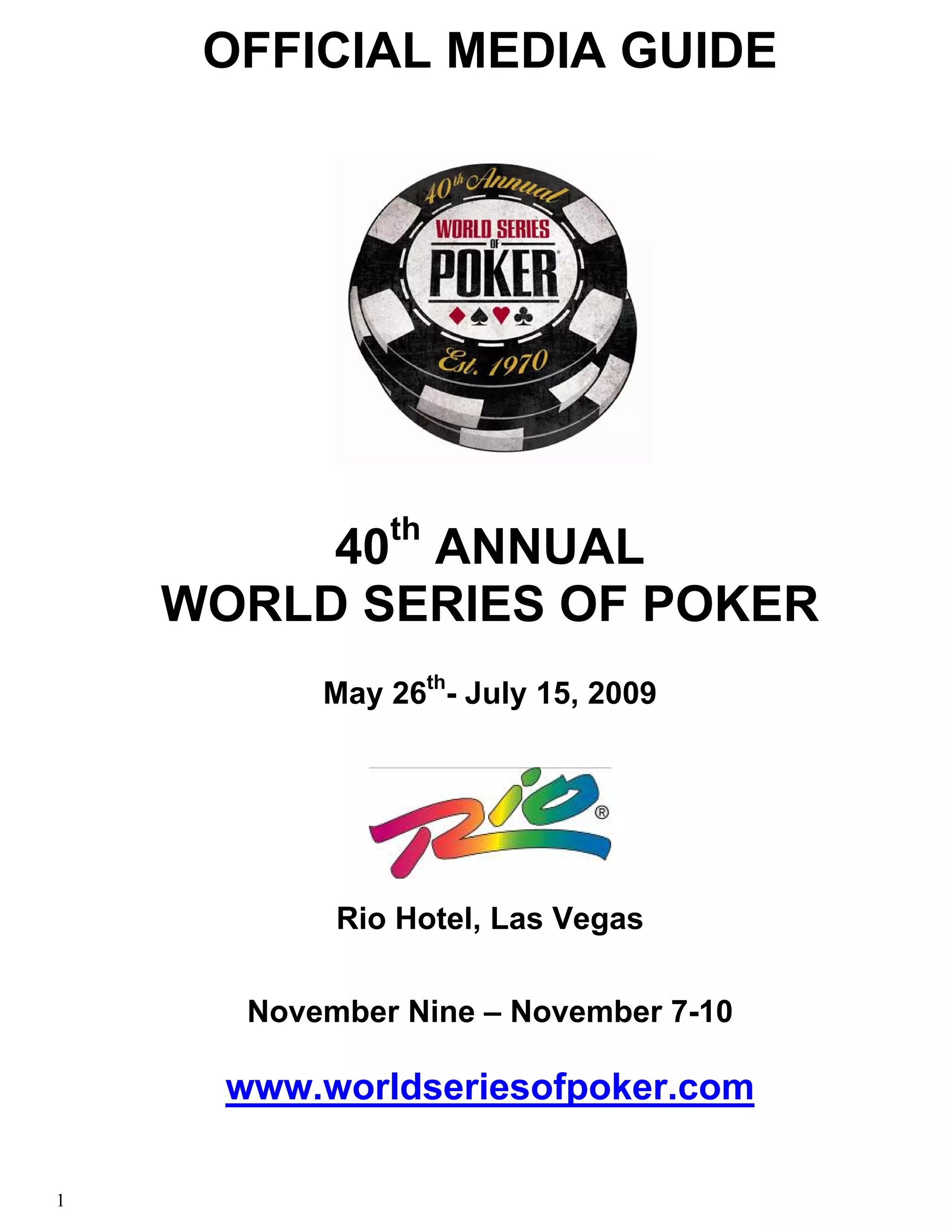 The document provides an official media guide for the 40th annual World Series of Poker occurring from May 26th to July 15th, 2009 at the Rio Hotel in Las Vegas, with details on the 57 scheduled bracelet events, event schedules, participating players, and historical information about the WSOP.