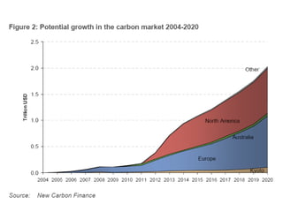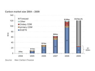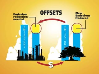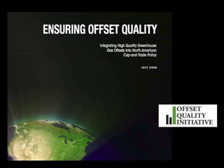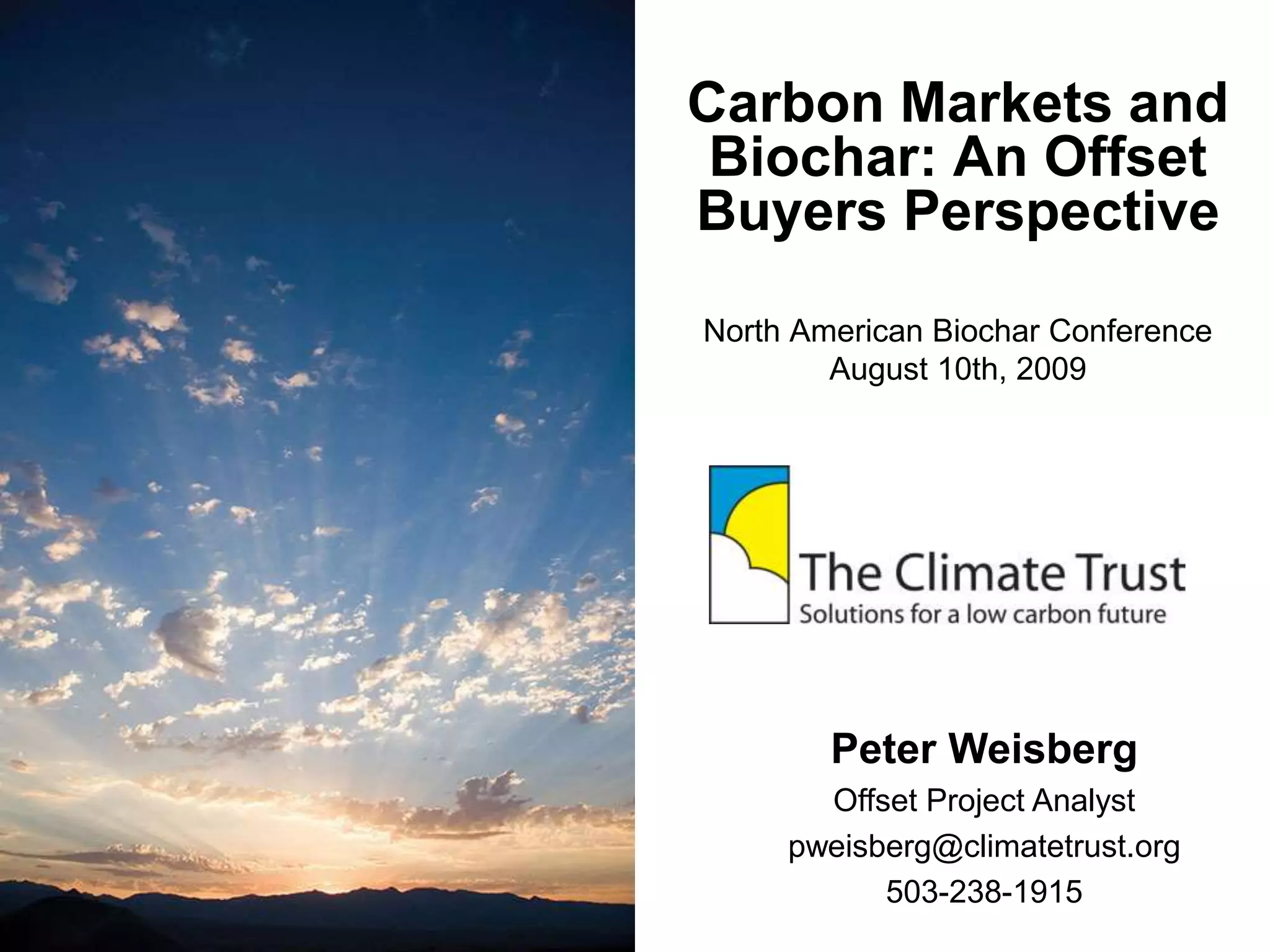 This document discusses how carbon offsets could support biochar projects and some of the methodology issues involved. It outlines the theory behind offsets and trends in the US offset market favoring domestic projects that destroy methane emissions or involve sequestration through forestry or soil management. The document discusses potential greenhouse gas reductions from biochar projects and issues with developing methodologies around ensuring permanent sequestration, ownership, and environmental impacts. It also covers how The Climate Trust currently funds offset projects and the development process involved.