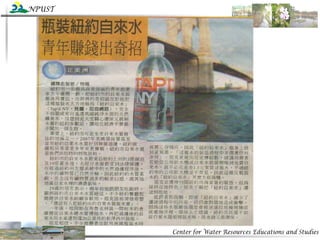 “ Access tosafe water is a fundamental human need and, therefore, a basic human right. Contaminated water jeopardizes both the physical and social health of all people. It is an affront to human dignity.” Kofi Annan, United Nations Secretary-General “ 安全用水是人類最根本的需要,因此也是最基本的人權 飲用受到污染的水不但危及人類社會健康,更是對人性尊嚴的一種侮辱” 聯合國秘書長 科菲 · 安南 人類生存三大要素之一