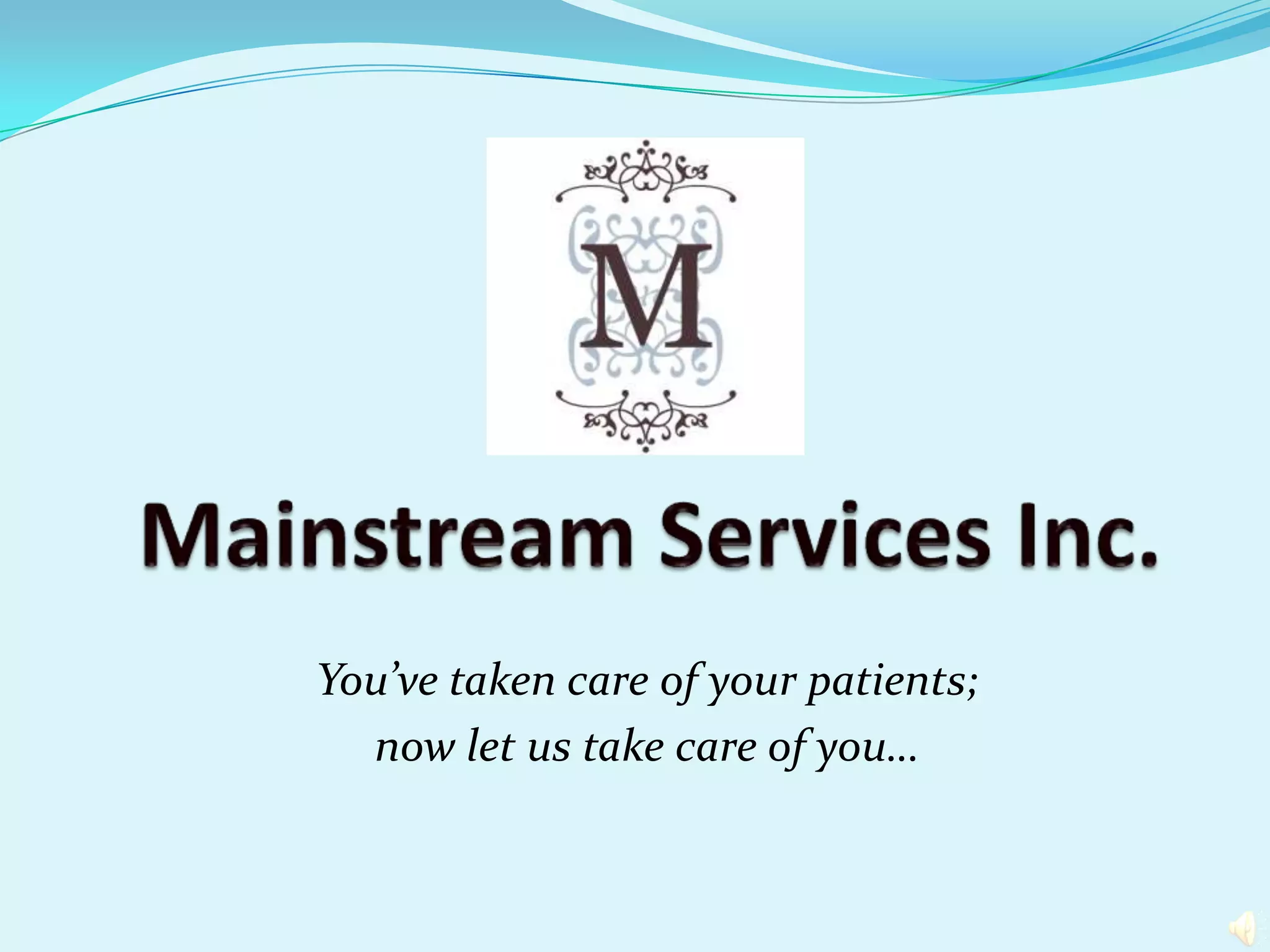 Mainstream Services Inc. is an electronic medical billing company that offers claims processing and management services to physicians. They have over 20 years of experience in medical billing and their specialists are certified. Their goal is to allow physicians to focus on patient care by taking care of billing needs. They offer HIPAA compliant claims processing, collections, patient statements, and other services to reduce costs for physicians compared to handling billing in-house. They aim to provide exceptional client service and fulfill client needs expeditiously.