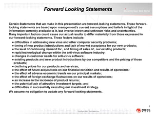 Trend Micro reported financial results for the first quarter of 2009. Revenue declined 11% year-over-year to 22.9 billion yen due to unfavorable foreign exchange rates. Operating income fell 16% to 7 billion yen while net income grew 5% to 4.8 billion yen. Bookings increased 13% excluding foreign exchange impacts. The company acquired Third Brigade to strengthen its network security offerings.