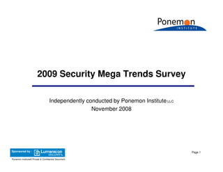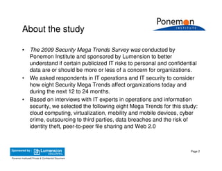 The 2009 Security Mega Trends survey, conducted by Ponemon Institute and sponsored by Lumension, identifies eight significant security trends impacting organizations: cloud computing, virtualization, mobility, cyber crime, outsourcing, data breaches, peer-to-peer file sharing, and Web 2.0. The study highlights the increasing security risks associated with adopting these technologies and practices, reflecting the concerns of IT professionals regarding the protection of personal and confidential data. The survey findings indicate a growing dependence on mobile workforces and cloud services, with organizations recognizing the heightened cyber threats as they navigate these evolving landscapes.