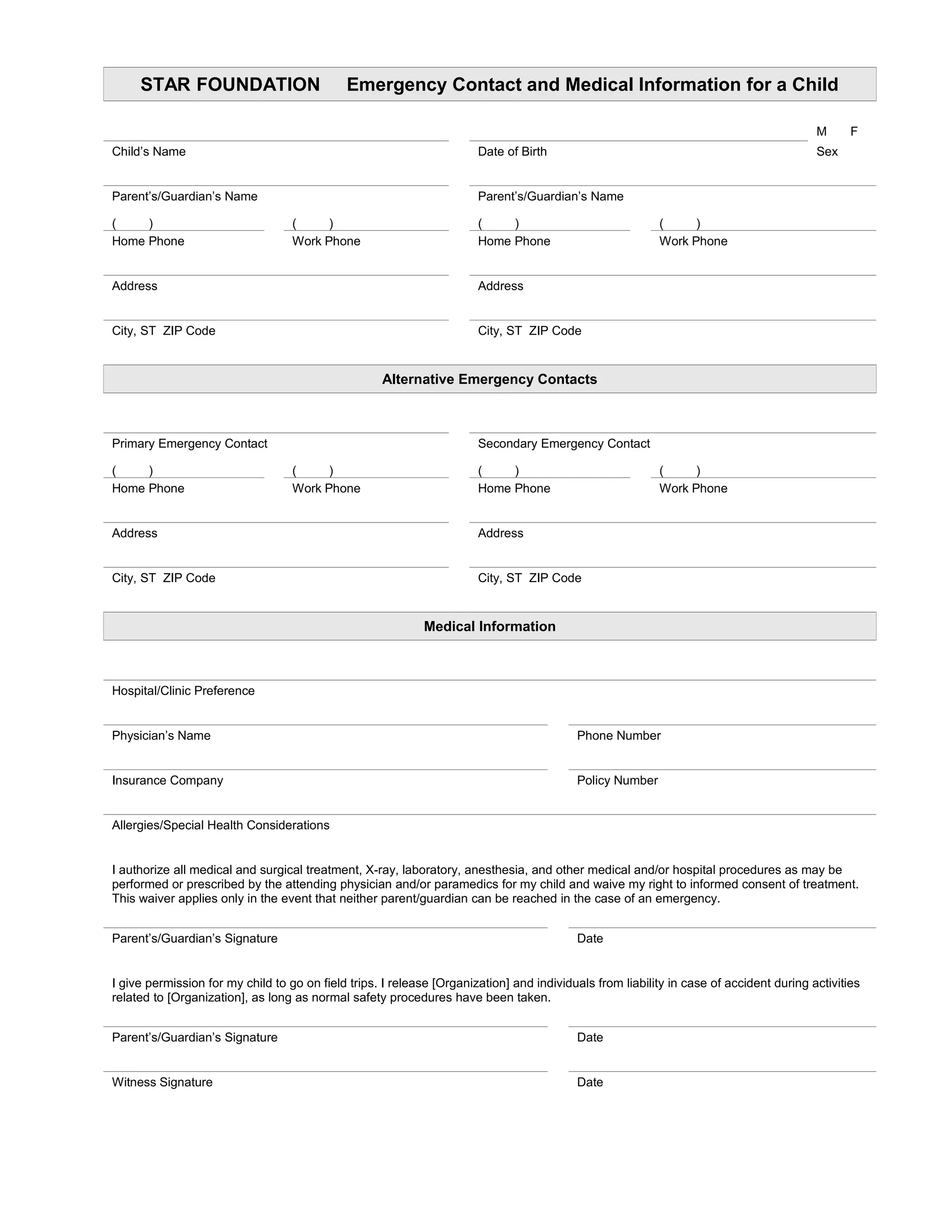 ![STAR FOUNDATION Emergency Contact and Medical Information for a Child