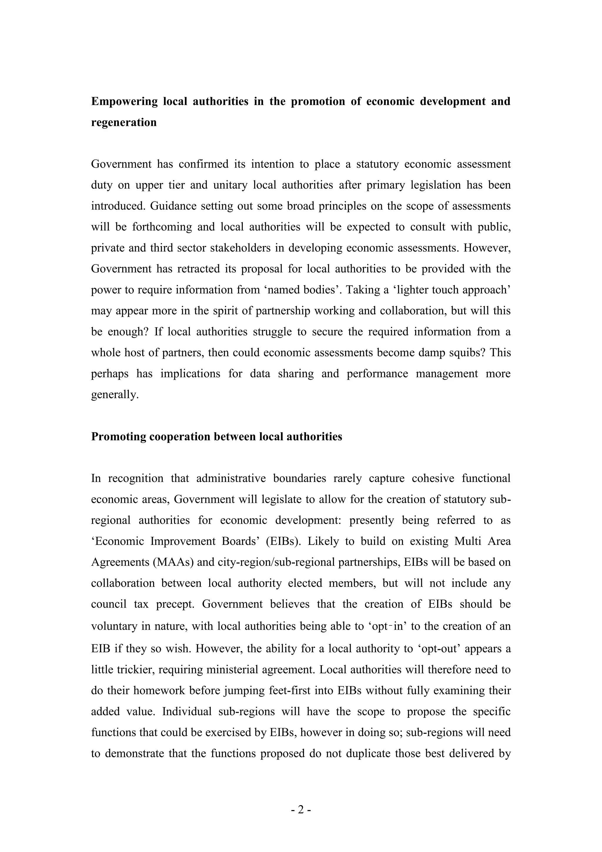 The document reviews the government's response to the sub-national review of economic development and regeneration, highlighting its four main principles aimed at empowering local authorities and promoting collaboration. It critiques the adequacy and potential limitations of the government's proposals, suggesting that they may not fundamentally change urban governance and regeneration practices. Ultimately, the document argues that the response is a missed opportunity, leaving many unanswered questions regarding the effectiveness and implementation of the new strategies.