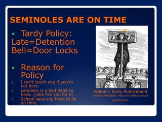 This document outlines Coach Tomes' expectations for students. It discusses policies around being on time, dress code, cell phone use, and classroom behavior. Students are expected to show success, energy, have necessary materials, act immediately when asked, be respectful, keep organized, listen, have self-esteem, and smile. The document warns against "being a squirrel" which means not sitting still, making messes, taking things, getting into places one shouldn't, vandalizing, making noises, making foolish decisions, and never sitting still. Being a squirrel will result in not graduating and having bad things happen.