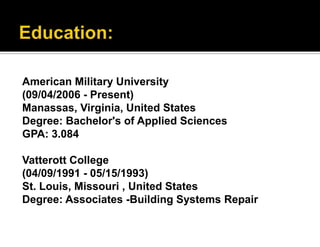 Sandra Bardsley has over 25 years of experience in HVAC, facilities maintenance, and environmental remediation. She has a Bachelor's degree in Applied Sciences and an Associate's degree in Building Systems Repair. She is EPA certified in HVAC and MVAC and has extensive training in plumbing, electrical work, and welding. She has worked for URS Corporation, Colliers International, and The Ritz Carlton in roles such as MVAC Mechanic, Environmental Remediation Field Operator, and Maintenance Engineer.