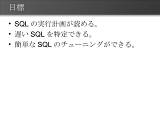 実行計画の読み方③ 下から順番に実行される。 COSTが大きい箇所は遅い原因の可能性が。testdb=# explain select * from place_master p , member m testdb=# where p.pid = 5 and p.pid = m.pid order by m.id limit 10; QUERY PLAN ----------------------------------------------------------------------------------------- Limit (cost=517.11..517.13 rows=10 width=638) -> Sort (cost=517.11..517.74 rows=252 width=638) Sort Key: f.fid -> Nested Loop (cost=0.00..511.66 rows=252 width=638) -> Index Scan using place_master_pid on place_master p (cost=0.00..4.41 rows=1 width=599) Index Cond: (pid = 5) -> Index Scan using member_pid on member m (cost=0.00..504.73 rows=252 width=39) Index Cond: (m.pid = 5) ① ② ③ ④ ⑤