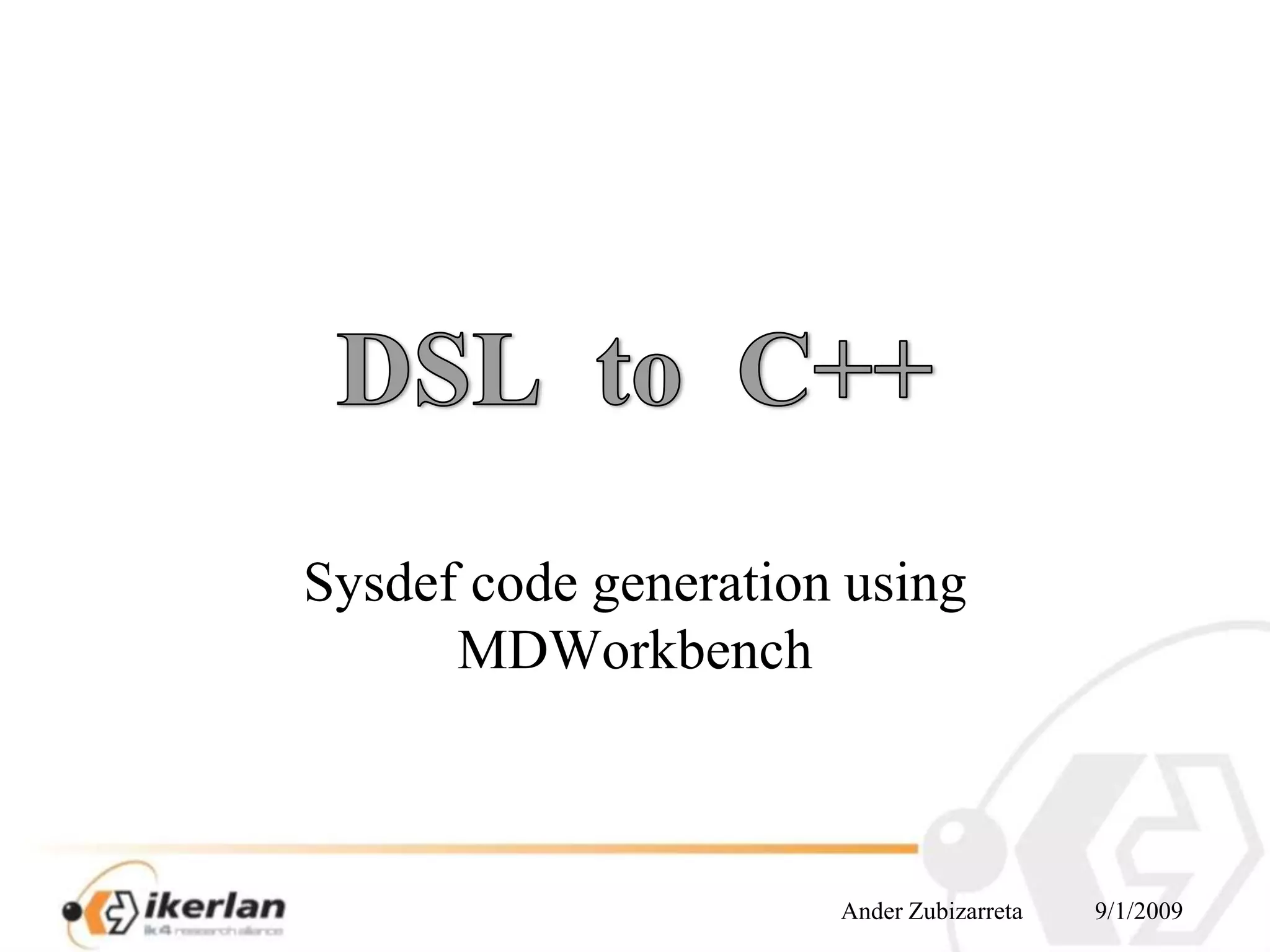 The document describes using MDWorkbench to generate C++ code from an XML system description file.
