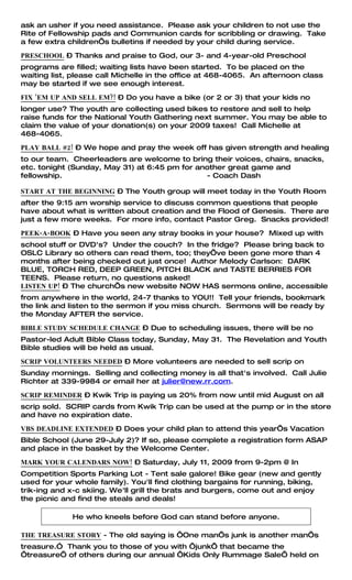 This document provides information about Our Saviour Lutheran Church for the week of May 31, 2009. It includes contact information for church staff, the giving report from May 24, schedules for worship services and activities throughout the week, announcements about upcoming events, and other notices.