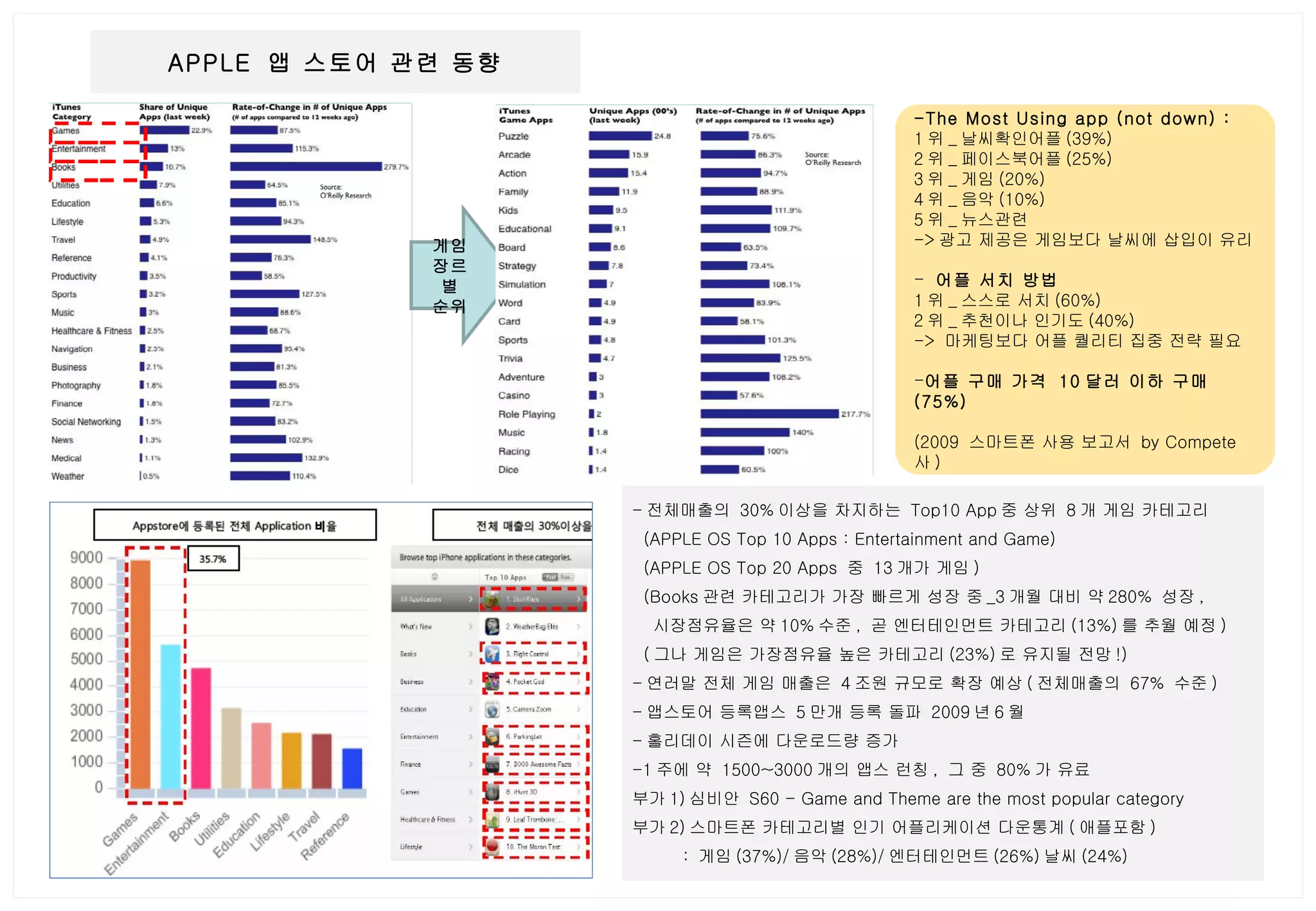 게임 장르별 순위APPLE 앱 스토어 관련 동향 - 전체매출의 30% 이상을 차지하는 Top10 App 중 상위 8 개 게임 카테고리 (APPLE OS Top 10 Apps : Entertainment and Game) (APPLE OS Top 20 Apps 중 13 개가 게임 ) (Books 관련 카테고리가 가장 빠르게 성장 중 _3 개월 대비 약 280% 성장 , 시장점유율은 약 10% 수준 , 곧 엔터테인먼트 카테고리 (13%) 를 추월 예정 ) ( 그나 게임은 가장점유율 높은 카테고리 (23%) 로 유지될 전망 !) - 연러말 전체 게임 매출은 4 조원 규모로 확장 예상 ( 전체매출의 67% 수준 ) - 앱스토어 등록앱스 5 만개 등록 돌파 2009 년 6 월 - 홀리데이 시즌에 다운로드량 증가 -1 주에 약 1500~3000 개의 앱스 런칭 , 그 중 80% 가 유료 부가 1) 심비안 S60 - Game and Theme are the most popular category 부가 2) 스마트폰 카테고리별 인기 어플리케이션 다운통계 ( 애플포함 ) : 게임 (37%)/ 음악 (28%)/ 엔터테인먼트 (26%) 날씨 (24%) -The Most Using app (not down) : 1 위 _ 날씨확인어플 (39%) 2 위 _ 페이스북어플 (25%) 3 위 _ 게임 (20%) 4 위 _ 음악 (10%) 5 위 _ 뉴스관련 -> 광고 제공은 게임보다 날씨에 삽입이 유리 어플 서치 방법 1 위 _ 스스로 서치 (60%) 2 위 _ 추천이나 인기도 (40%) -> 마케팅보다 어플 퀄리티 집중 전략 필요 어플 구매 가격 10 달러 이하 구매 (75%) (2009 스마트폰 사용 보고서 by Compete 사 )