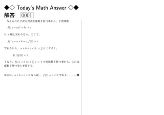 This document provides the solution to a math question about solving a quadratic equation ax^2 + bx + c = 0, where a+b+c < 0 and c < 0. It states that because a+b+c < 0 and c < 0, the equation must have roots between 0 and 1, as f(1)f(0) = (a+b+c)c < 0. Therefore, the solutions to the quadratic equation are between 0 and 1.