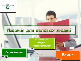 Документ анализирует особенности медиа-планирования для деловых изданий, включая сегментацию целевой аудитории и ключевые медиа-показатели. Основное внимание уделяется читателям в возрасте 25-54 лет с высоким уровнем дохода, а также описываются предпочтения и критерии выбора изданий для достижения максимального охвата и соответствия. В документе приведены данные и выводы о популярности различных бизнес-изданий и их позиционировании на рынке.