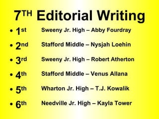 This document lists the results of various competitions held by the University Interscholastic League (UIL) on January 8, 2010. It provides the rankings and names of students who placed 1st through 6th in categories such as editorial writing, ready writing, art, calculator, dictionary, listening, maps/charts/graphs, math, music memory, number sense, science, social studies, spelling, impromptu, modern oratory, and oral reading for 6th, 7th and 8th grades. The document recognizes achievements of students from multiple schools including Sweeny Jr. High, Stafford Middle, West Brazos Jr. High, Wharton Jr. High, Needville Jr. High, and Royal Middle.