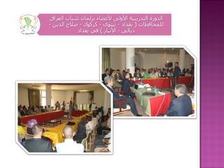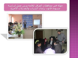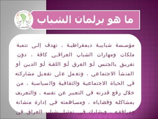 برلمان الشباب في العراق يهدف إلى تعزيز مهارات وقدرات الشباب في المشاركة الفعالة بالحياة الاجتماعية والسياسية. يشمل البرلمان تمثيل الشباب من جميع المحافظات مع تعزيز المشاركة النسائية، ويتضمن خطة لتطوير مهاراتهم القيادية ومواهبهم. يتناول parlament issues like housing crisis and the role of youth in political processes, focusing on training and community engagement.