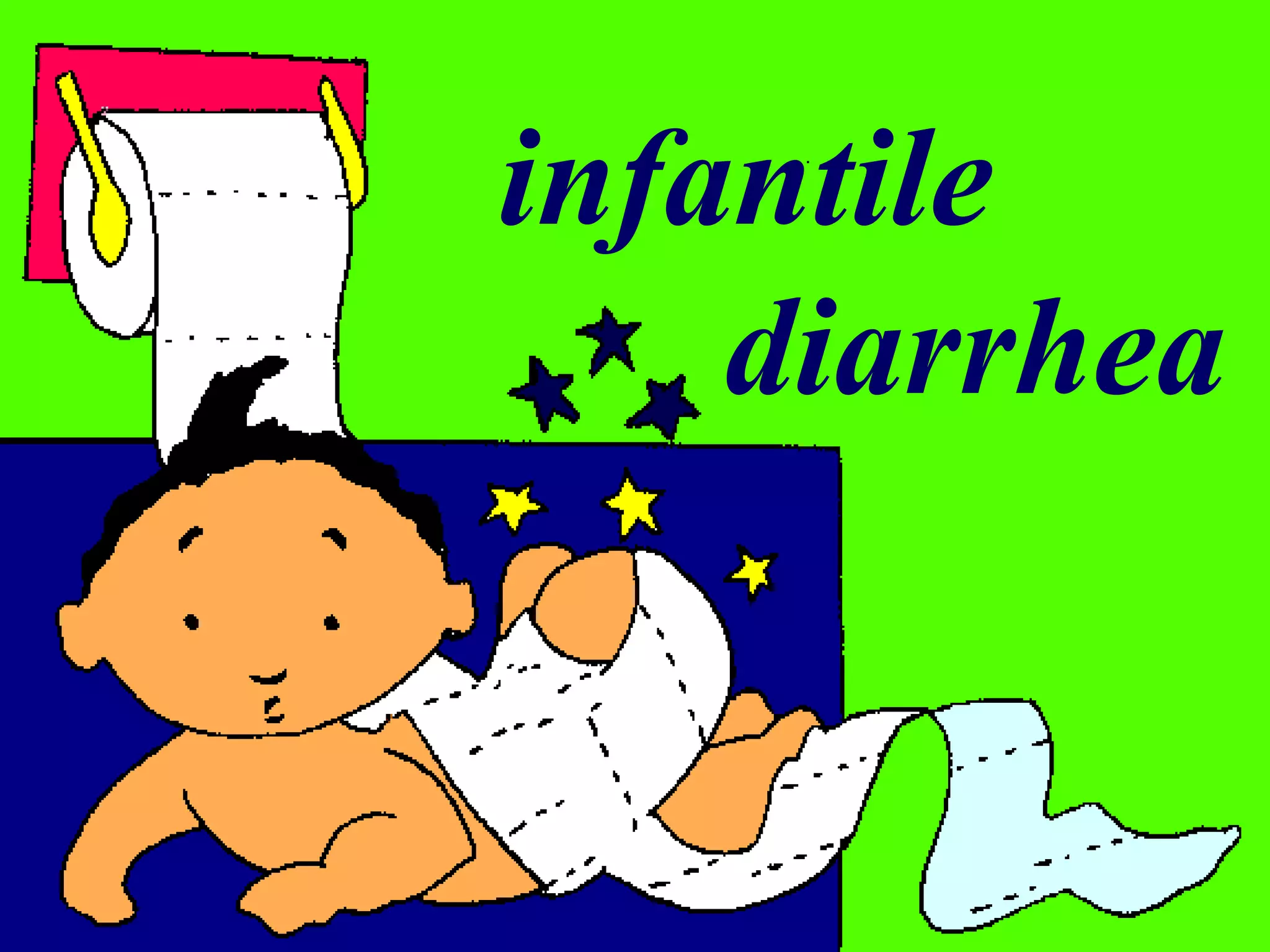 The document discusses infantile diarrhea including its etiology, pathogenesis, clinical manifestations, diagnosis, and treatment. It causes are multi-factorial and can be infectious, like rotavirus or E. coli, or non-infectious, like improper diet. Pathogenesis involves mechanisms like osmotic diarrhea, secretory diarrhea, or abnormal motility. Clinical manifestations include gastrointestinal symptoms, systemic toxic symptoms, and water/electrolyte disturbances. Types of dehydration are also described.