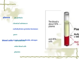 The document discusses features of blood in children, including plasma, blood cells, and hematopoiesis. Hematopoiesis is the process of blood cell production, which occurs in the mesoblast, liver, spleen, and bone marrow during fetal development and shifts to primarily the bone marrow after birth. The document provides details on red blood cells, white blood cells, platelets, and blood volume in children at different ages. It also discusses anemia and the classification of anemia severity based on hemoglobin and red blood cell counts.