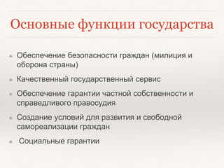 Документ описывает основные функции и задачи государства Украины, акцентируя внимание на обеспечении безопасности граждан, социальными гарантиями и экономическим развитием. Предлагаются краткосрочные реформы, направленные на укрепление экономики, борьбу с коррупцией и улучшение качества государственного сервиса, включая дерегуляцию бизнеса и стимулирование предпринимательства. Основные направления реформ на 1-3 года охватывают энергетическую безопасность, реформу государственного управления, экономическое развитие и социальные реформы.