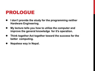 This lecture helps students learn proper computer use and the role of information technology. It covers various topics to improve general computer skills like maintaining computer performance, file management, using applications, and cloud computing. The lecture is delivered over 7 days and includes lessons on creating websites and blogs, Microsoft Office skills, GPS data processing, and collaborating with smartphones.