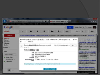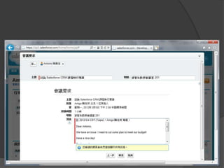 This document provides a summary of the key capabilities of cloud-based CRM using Salesforce.com. It discusses how Salesforce allows users to manage customer data and collaborate on accounts, leads, opportunities, and activities. It also describes how Salesforce supports sales, marketing, customer service and knowledge management through features like reports, dashboards and customization options.