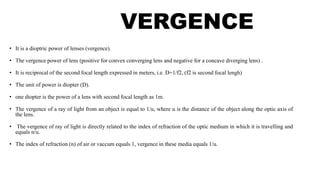 Vergence refers to the dioptric power of lenses. It is equal to the reciprocal of the second focal length and is measured in diopters. The Gullstrand schematic eye model provides cardinal data on the optical elements and structure of the human eye, including refractive indices, radii of curvature, and positions. Listing's reduced eye model simplifies the eye into a single refracting surface to allow for easier calculations of refraction. Visual acuity refers to spatial visual discrimination and is measured as the reciprocal of the minimum resolvable visual angle. It depends on factors like illumination, contrast and the physical and physiological components of the visual system.