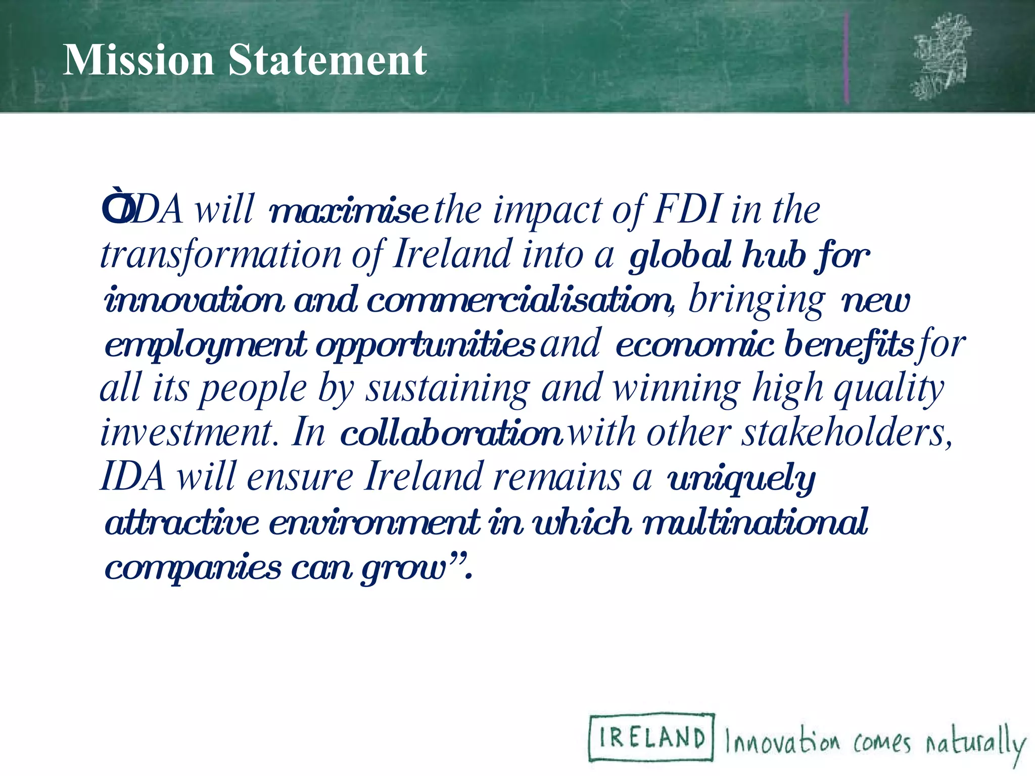 IDA's mission is to maximize the impact of foreign direct investment (FDI) in transforming Ireland into a global hub for innovation and commercialization, bringing new jobs and economic benefits for Irish people. IDA will work with stakeholders to ensure Ireland remains an attractive place for multinational companies to grow.