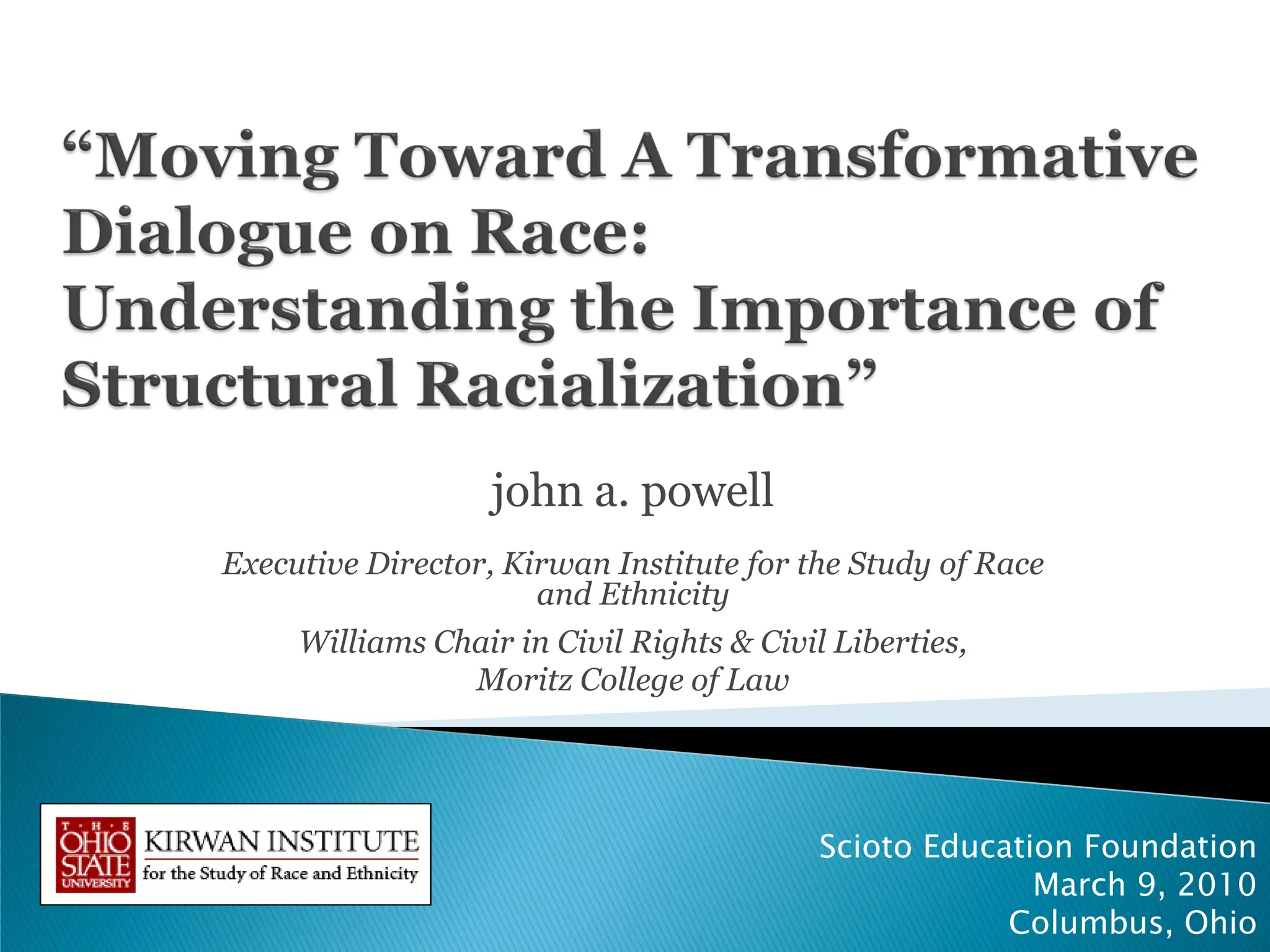 John A. Powell discussed structural racialization and opportunity structures. Structural racialization refers to how institutions interact to produce racialized outcomes, even without racist intent. Opportunity structures like housing, employment, education are not equally available to all people. Some benefit from structures that act like an "up escalator" while others face structures like a "down escalator". A systems approach is needed to address how global trends and changing conditions impact opportunity.