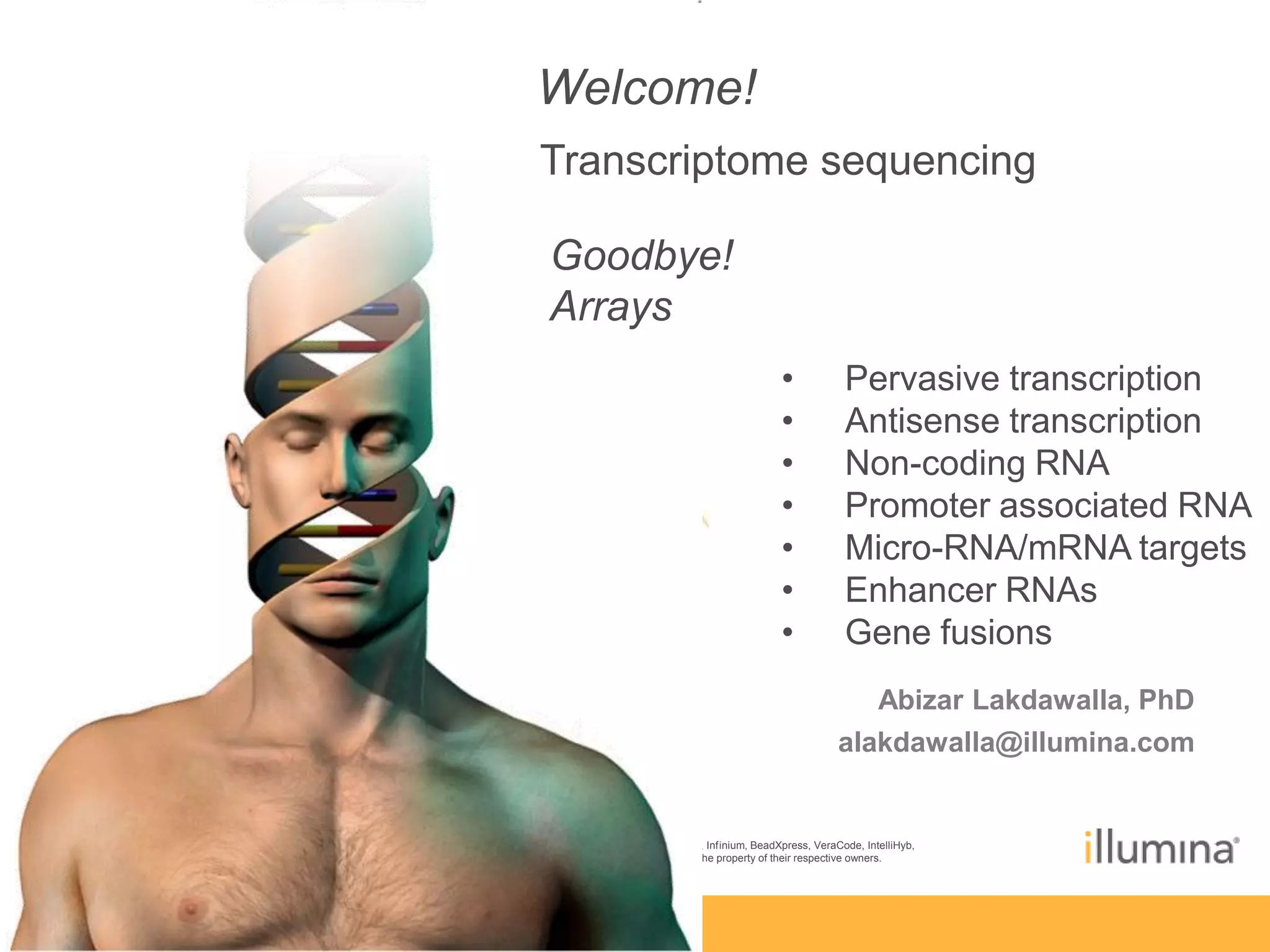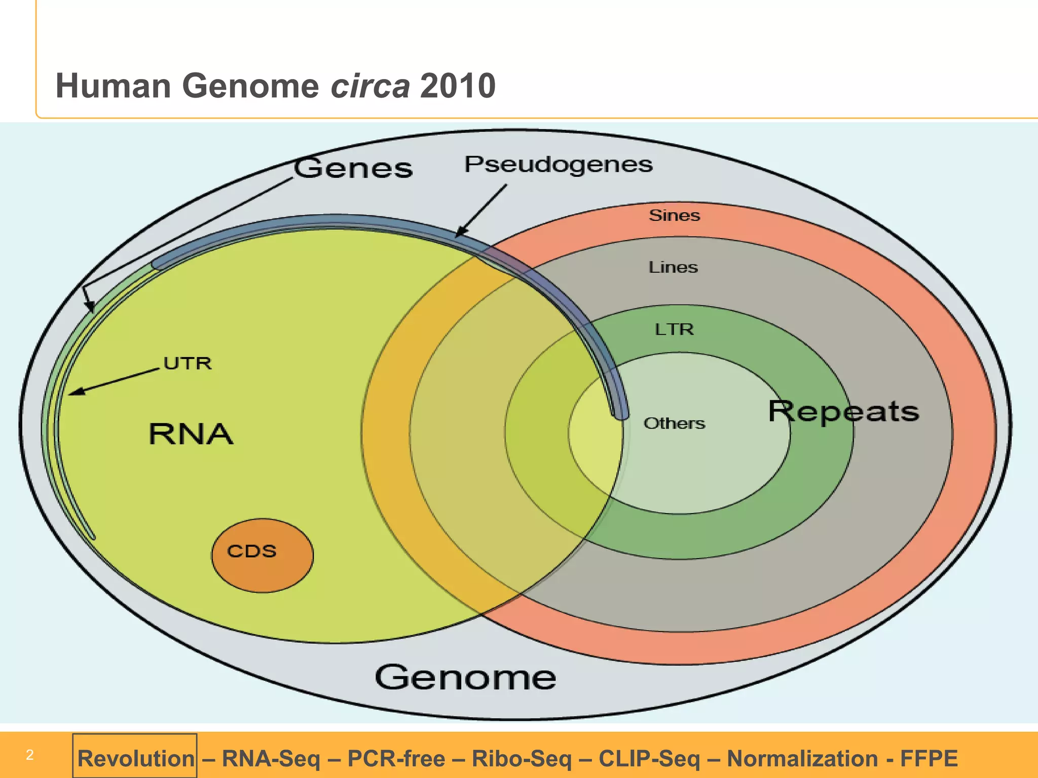 This document discusses RNA sequencing (RNA-Seq) and related techniques. It introduces total RNA sequencing which allows sequencing of all RNA molecules from a sample, including non-coding RNA, using less than 100ng of input RNA. Double-strand specific nuclease (DSN) normalization is described as a method to normalize total RNA sequencing libraries. The document also discusses applying RNA sequencing to analyze formalin-fixed paraffin-embedded (FFPE) samples.