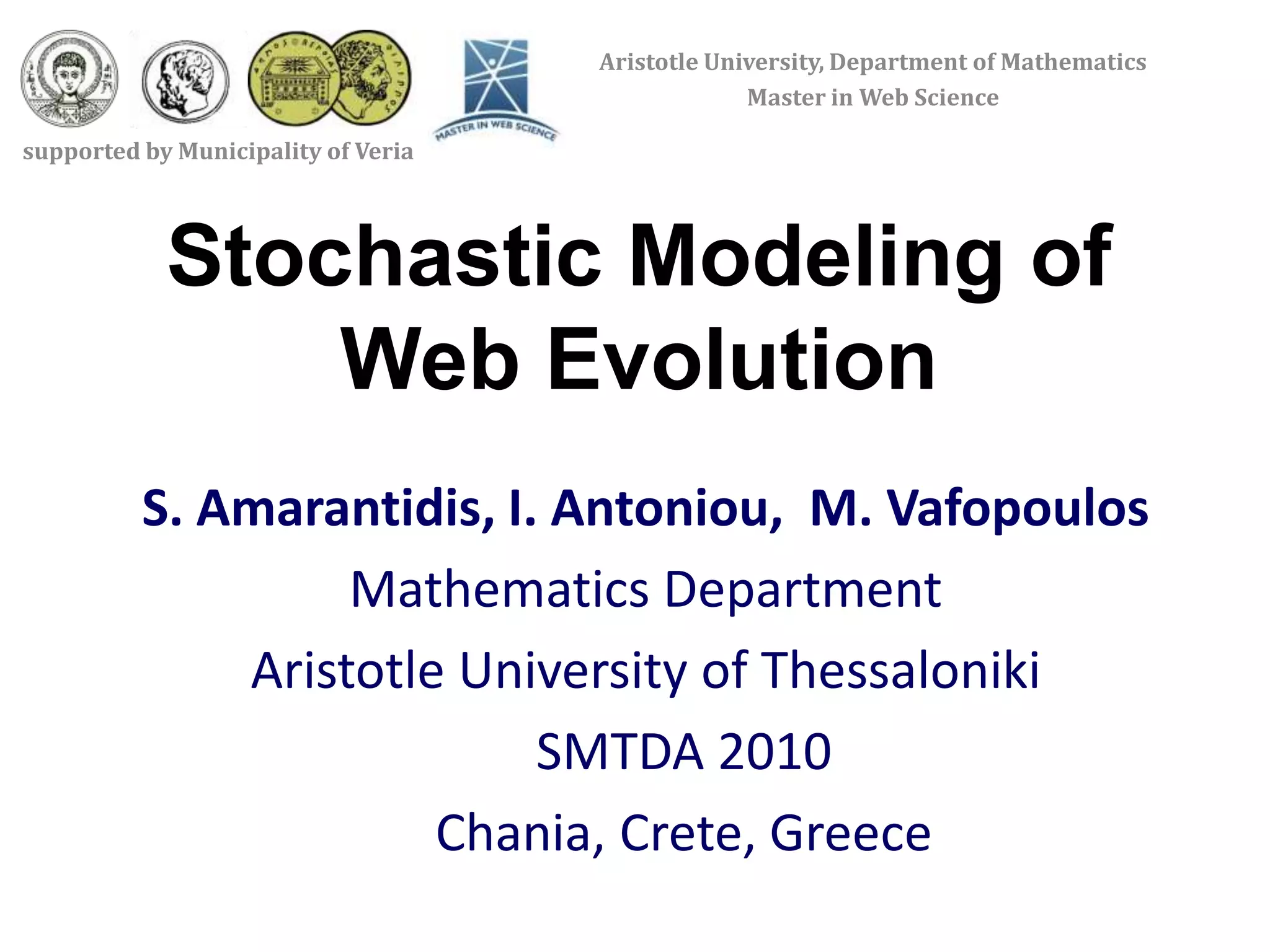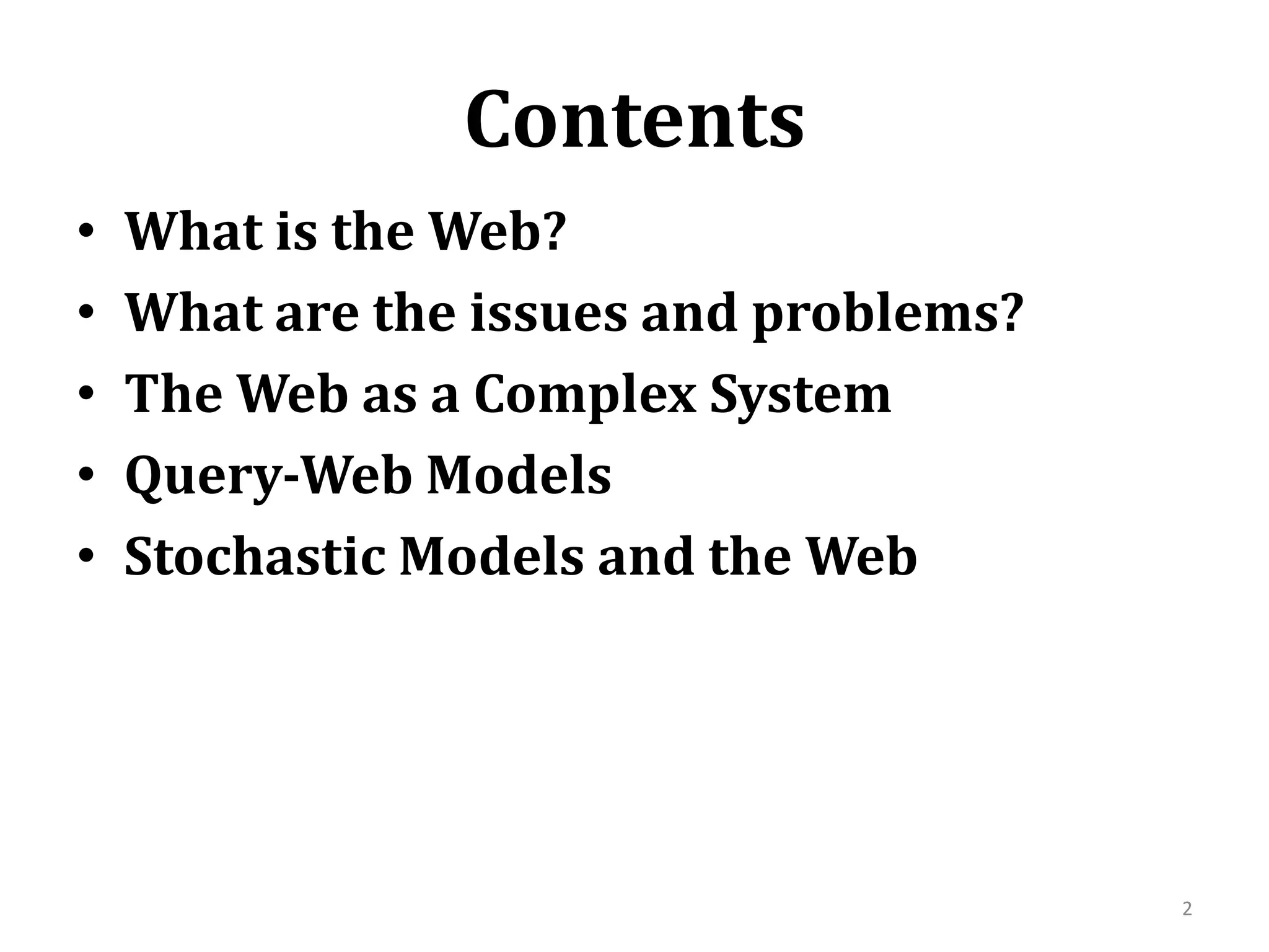 The document summarizes research on modeling the evolution of the World Wide Web as a complex system. It discusses the Web's structure as a directed graph and statistical properties like power law degree distributions and small world properties. It describes models of Web traffic and evolution that use concepts from statistical physics and complex networks. Game theoretic and query-based models are also summarized. The document focuses on a query-Web model that explains the Web's scale-free structure through the interaction of users, documents, and search engines.