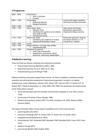 This document provides an overview of a workshop on enquiry-based, experiential learning. The workshop aims to explore a range of practices related to situated teaching and support several learning outcomes related to identifying and applying enquiry-based techniques. The workshop agenda includes presentations, open discussions, design exercises, and opportunities to practice hands-on techniques. Key themes that will be explored are enquiry-based learning, experiential learning, and situated learning. Examples of approaches that will be discussed include action learning, action research, project-based learning, and problem-based learning. Criteria for evaluating practices, such as scholarship models and professional standards frameworks, will also be examined.