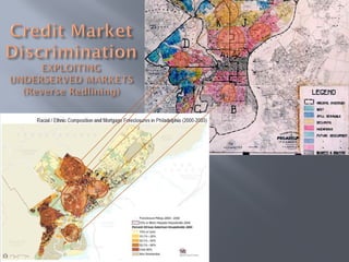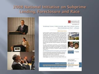 The document discusses the interconnected issues of fair housing and fair credit. It notes that unequal dual housing and credit markets developed together due to discriminatory policies like redlining. Moving forward, the document argues that reforming the financial system requires addressing its racial inequities and ensuring all communities have access to fair and affordable credit. Local context matters, so solutions require input from communities most affected by lending abuses and lack of access to financial services and homeownership opportunities.