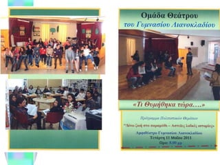 Αγαπητή μας Γ΄τάξη Το τρίχρονο ταξίδι σας στο μικρό μας σχολείο, το Γυμνάσιο Λιανοκλαδίου τελειώνει… Οι συμμαθητές σας και οι καθηγητές σας , μέσα από την καρδιά μας, σας ευχόμαστε να είστε πάντα γεροί, δίκαιοι και χαρούμενοι άνθρωποι! Ανοίξτε τα φτερά σας, πετάξτε ψηλά και κατακτήστε τα όνειρά σας!!! Να προσέχετε, γιατί αν δεν κοιτάτε εκεί που θέλετε να πάτε, θα πάτε εκεί που κοιτάτε… Να θυμάστε τις μικρές και μεγάλες συμβουλές που δίνονταν στο σχολείο μας και τα έργα σας να είναι φτιαγμένα από αγάπη!