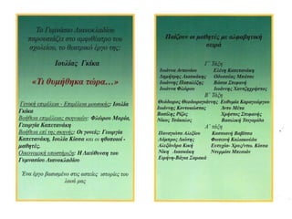 ΣΕΠ – Γ΄τάξη Οι μαθητές της Γ τάξης ανέπτυξαν το πρόγραμμα – Μάθημα Σχολικός επαγγελματικός Προσανατολισμός με την καθοδήγηση των συμβούλων καθηγητών Κου Κοντοκώστα Βασίλη και Κας Γκίκα Ιουλίας. Οι μαθητές προσπάθησαν να απαντήσουν στο ερώτημα, τι θα κάνουν μετά το Γυμνάσιο. Ασχολήθηκαν και έμαθαν για τον κόσμο της εργασίας. Περιέγραψαν επαγγέλματα. Δημιούργησαν και παρουσίασαν μονογραφίες επαγγελμάτων. Με τη χρήση ερωτηματολογίων προσπάθησαν να ανακαλύψουν τον εαυτό τους, τις αξίες τους, τα ενδιαφέροντά τους και τις ικανότητές τους. Προβληματίστηκαν για το πώς αντιλαμβάνονται τους συνανθρώπους τους. Μάθανε να την πληροφόρηση, την σημασία της, τα είδη πληροφόρησης, αναζήτησαν πηγές και πληροφορίες. Προσπάθησαν να σχεδιάσουν το μέλλον τους. Μάθανε για τη συνέντευξη, για το Βιογραφικό σημείωμα, να φτιάχνουν μια Αίτηση, να οργανώνουν τον ατομικό τους φάκελο, την ενεργό έρευνα.