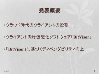 2012-08-28 アカデミッククラウドシンポジウム(公開版)「クライアント向け仮想化ソフトウェアBitVisorのクラウドへの応用」