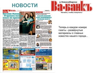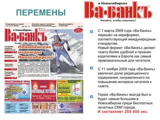 Газета «ва-банкъ», начиная с марта 2009 года, перешла на новый евроформат, что сделало издание более удобным и привлекательным для читателей. С тиражом 255,000 экземпляров, она занимает 1-е место среди бесплатных печатных СМИ Новосибирска и 2-е место среди всех печатных изданий города. Издание также активно оптимизирует аудиторию и предлагает разнообразное редакционное содержание, включая развёрнутые новости, интервью и конкурсы.