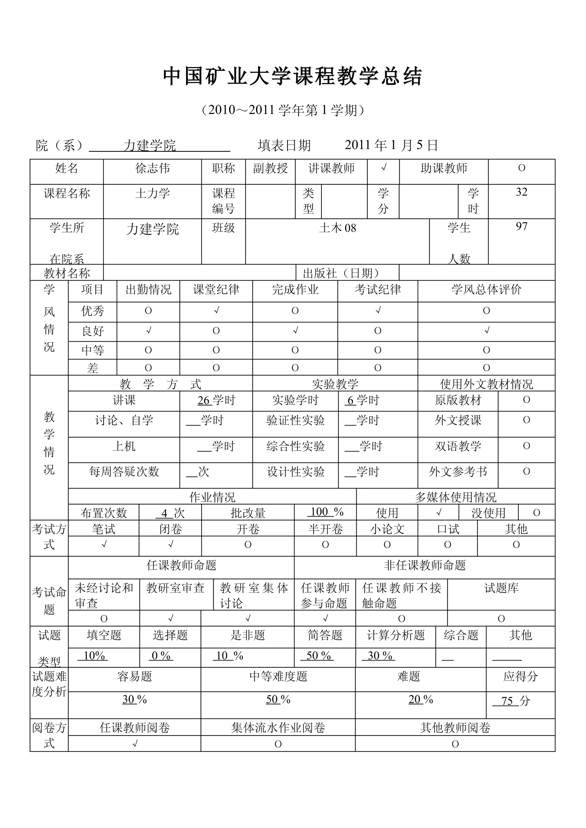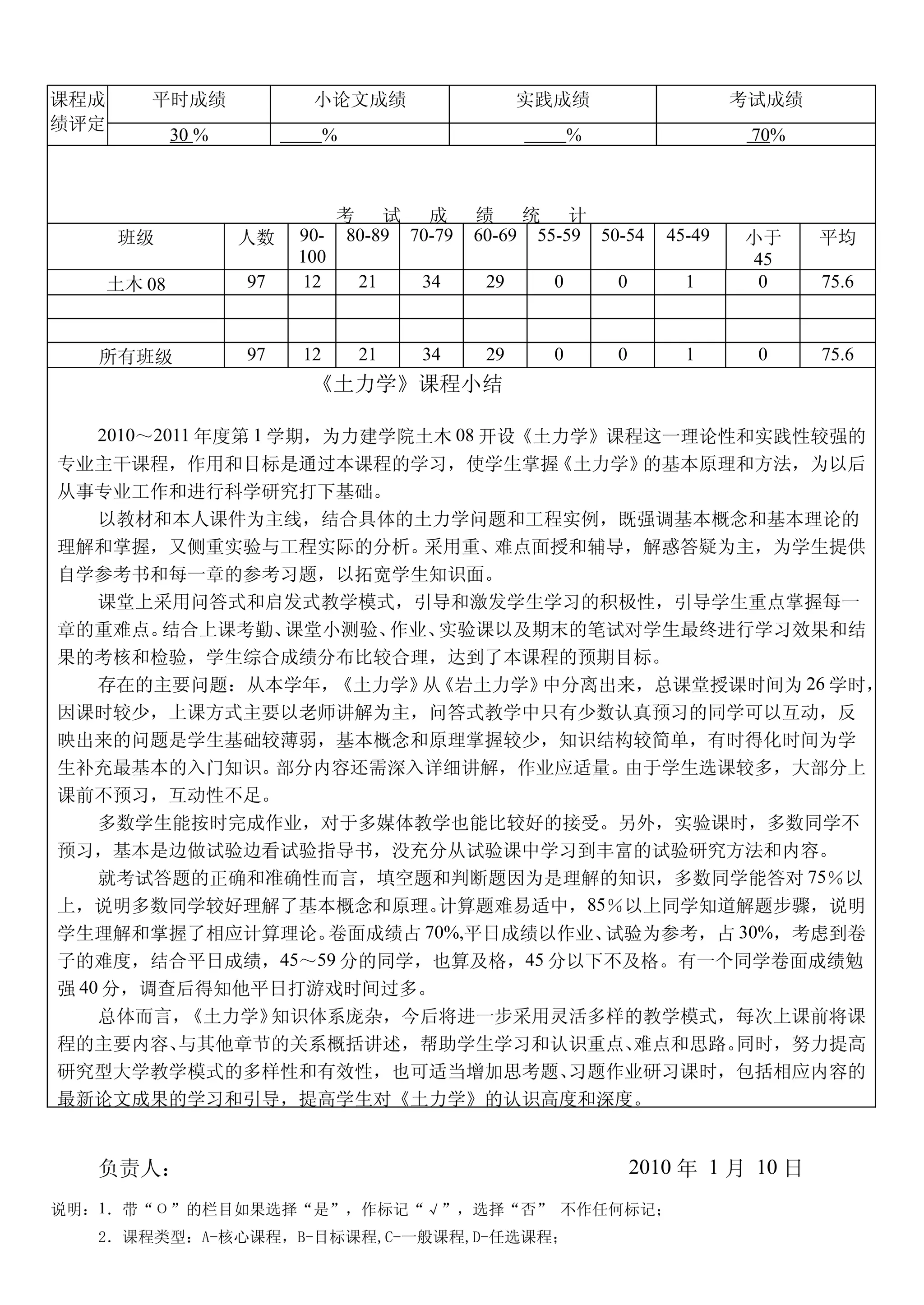 2010-2011学年第一学期,中国矿业大学力建学院开设了《土力学》课程,旨在帮助学生掌握土力学的基本原理与方法。课程采用讲授与实验相结合的方式,虽然学生在理解基本概念上表现良好,但互动性不足,基础较薄弱。未来计划通过灵活的教学模式和增加思考题来提高学生的学习效果。