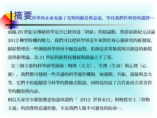 本報告討論了面對傳統科學的終結辯論和21世紀新科技的興起,強調身心靈研究的新理論有助於科學未來發展。在物理、生理和心理研究中,發現週期、共振等共通科學機制挑戰了舊有教條,並且展望頗具希望的科學未來。該文也涉及著名科學家的觀點,探討科學發現的可能性及其意義。