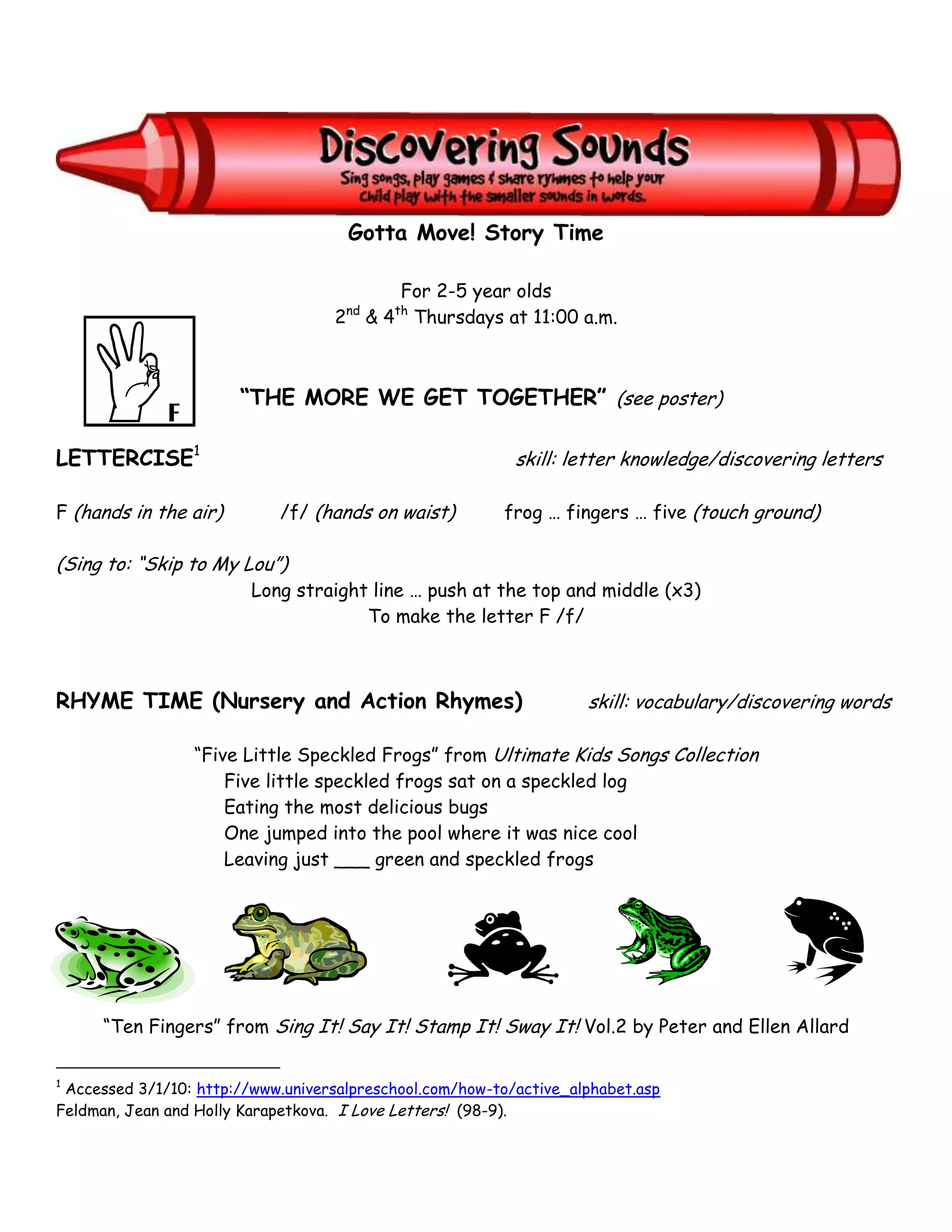 1) This document provides details about a story time event for 2-5 year olds focused on the letter F.