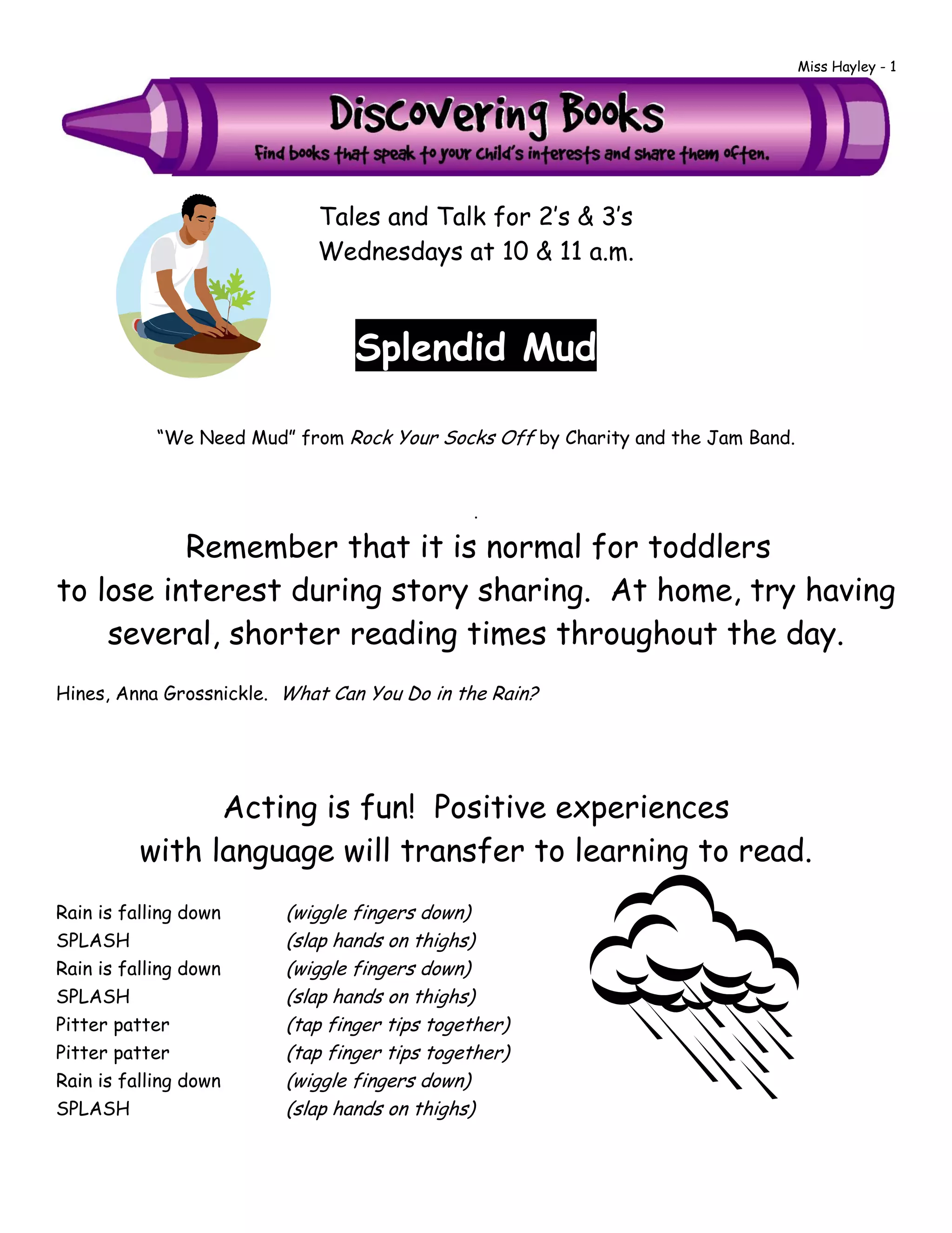 This document provides information about a story time program for toddlers called "Tales and Talk for 2's & 3's" held on Wednesdays at 10am and 11am. It includes the title of a song and book to be read, suggestions for reading with toddlers at home including having shorter reading sessions, and an interactive fingerplay song about rain. The document encourages sharing stories in different formats and exploring outdoors after rain, noting developmental benefits for children.