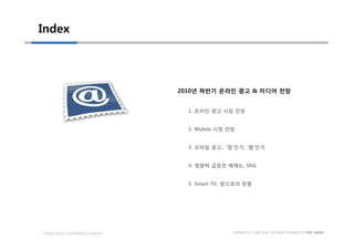 2010년도 하반기 광고시장에 대한 전망 보고서입니다. 온라인 광고시장과 모바일 시장의 성장 추이에 대해 예상해 보았으며, 상반기에 이어 지속적으로 이슈가 될 것으로 보이는 모바일, SNS, 스마트TV에 대해 전망하였습니다.