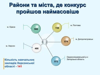 729574572466508м. Полтавам. Одесам.Дніпропетровськм. ХерсонОрджонікідзевський р-н Запорізька областьКількість навчальних закладів Херсонської області - 141Районита міста, де конкурс пройшов наймасовіше