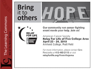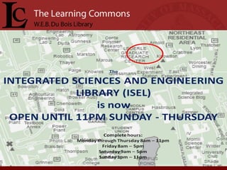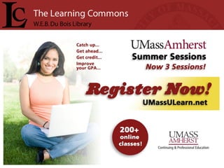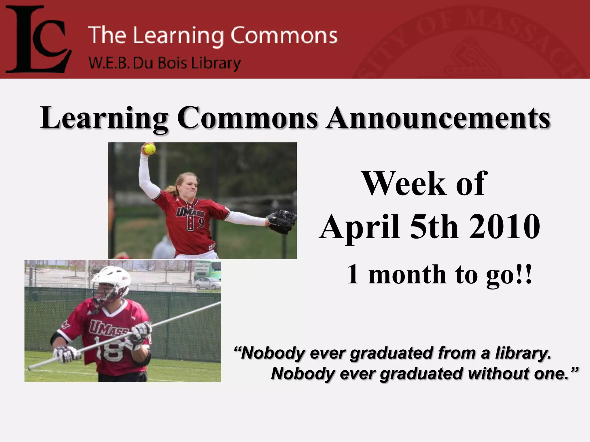 The document provides announcements for the week of April 5th 2010 at the UMass Amherst Learning Commons. It notes that there is one month left in the semester and quotes that "Nobody ever graduated from a library. Nobody ever graduated without one." It also welcomes students back to the newly expanded Learning Commons and details some of the renovations and added features.